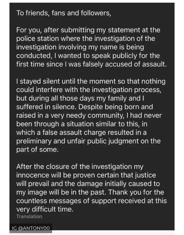 “Even though I was born and raised in a very underprivileged community, I had never been through a situation similar to this one, in which a false accusation of assault generated a prior and unfair public judgement by some people.